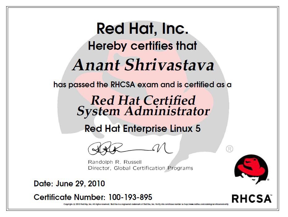 Facebook @anantshrivastava 23 December 2010, 22:35 Anant Shrivastava added a new photo. View original on Facebook → with RHEL 6 I have been promoted as RHCSA.