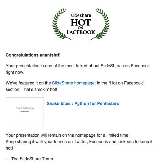 And the presentation becomes famous : thanks for the likes and visits. Ref : http://www.slideshare.net/anantshri/snake-bites-python-for-pentesters
