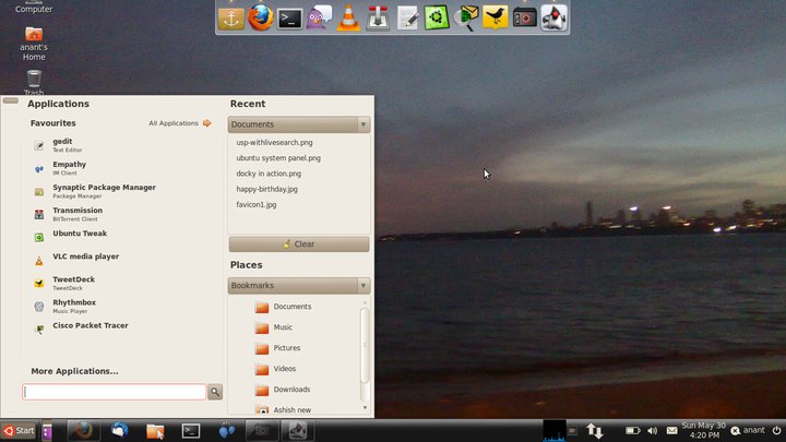 Ubuntu System panel showing my favourite applications along with my recently used document + common folders