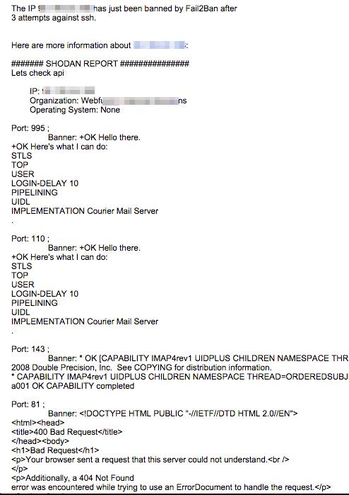 #TechnicalPostAlert : Who said #fail2ban reports need to be boring. Here is some spice into the reports. Now when a IP is banned due to multiple attacks on IP you can also get more details about the IP via shodan API. Funny to see what people are running. Sample report attached for the curious yet lazy once. https://github.com/anantshri/server_admin_scripts/tree/master/fail2ban