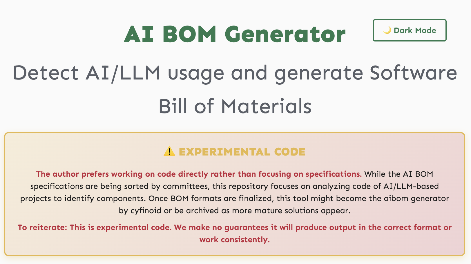 AIBOMMaker Experimental AI Bill of Materials generator. It scans GitHub repos for signs of LLM or AI usage in code, configs, CI and then lets you export an AI focused BOM in standard formats. πŸ”— App: https://cyfinoid.github.io/aibommaker/ πŸ”— Code: https://github.com/cyfinoid/aibommaker